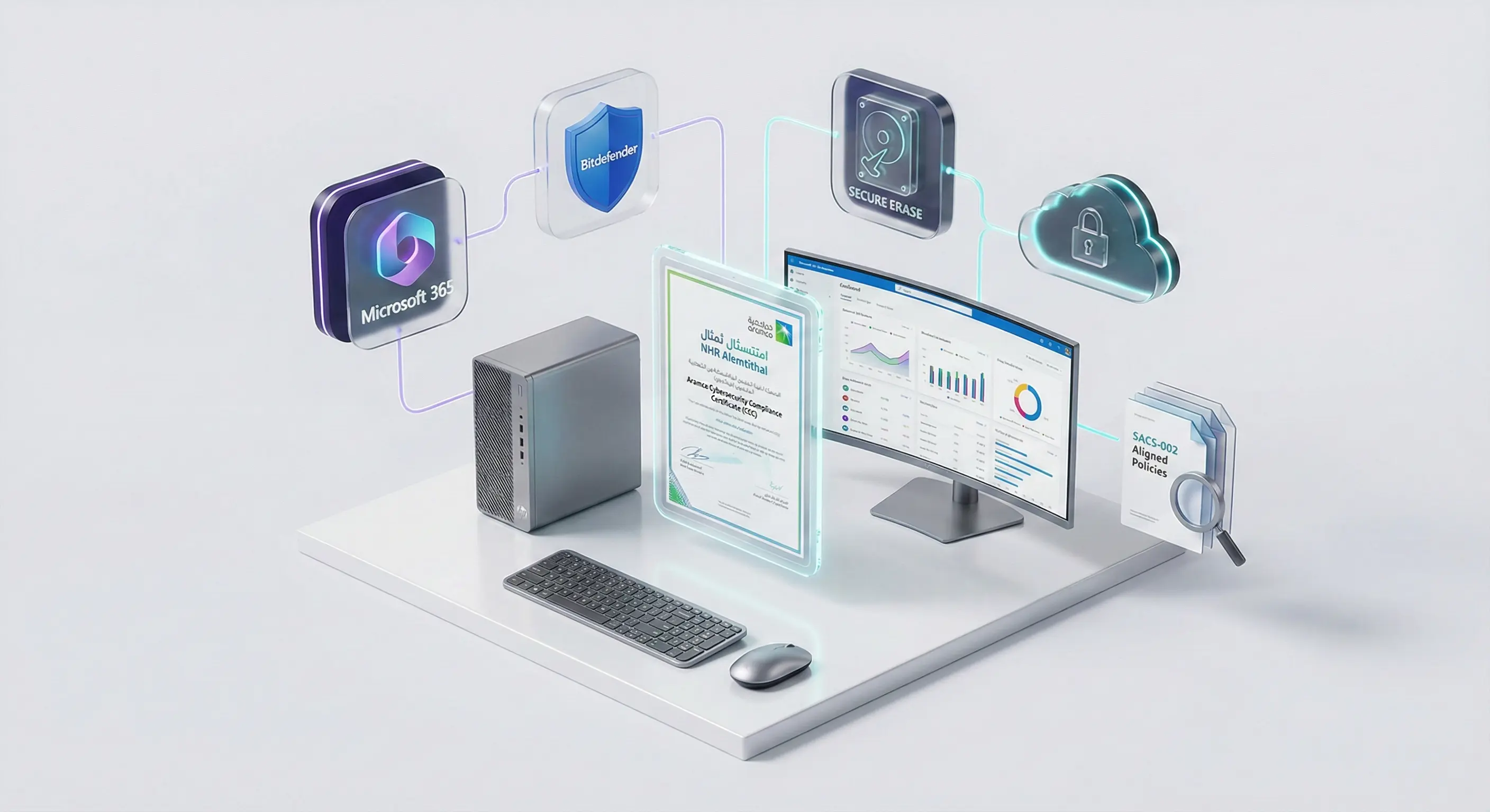 The Aramco Cybersecurity All-In-One Kit by NHR Alemtithal. We bundle PC, software, policies, and auditor fees into one transparent package with remote implementation support.